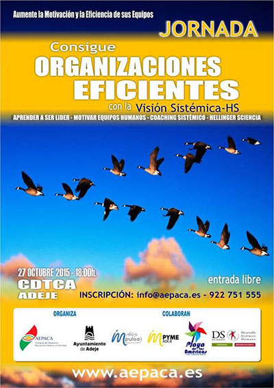 Jornada-CONSIGUE-ORGANIZACIONES-EFICIENTESPor la presente pasamos a informarles que A.E.P.A.C.A. organiza para el próximo martes 27 de Octubre la jornada«CONSIGUE ORGANIZACIONES EFICIENTES, con la Visión Sistémica HS», a las 18.00h, en las instalaciones del CDTCA, sita en C/ Las Jarcias 4 ·Urb. El Galeón, Adeje. Colaboran en el desarrollo de esta Jornada el Excmo. Ayuntamiento de Adeje, Adeje Impulsa, Adeje IMPyme, DS Humano y la Asociación de la Zona Comercial Abierta de Playa de Las Américas. Se adjunta cartel y programa, la entrada es gratuita, si desea inscribirse puede enviar un correo a;info@aepaca.es.