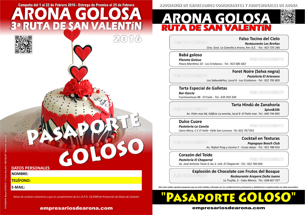 Para participar en esta ruta, cada cliente tendrá que exhibir su “pasaporte goloso”, editado con la relación de los establecimientos participantes, su ubicación y el nombre de sus propuestas para la ruta; podrá ser retirado en la sede de la A.E.C.P. Arona o descargarlo directamente de la web de esta asociación.