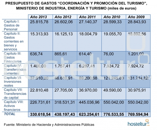 Los Presupuestos Generales del Estado 2013 contemplan una partida de 330,6 millones de euros para la “Coordinación y Promoción del Turismo”, un 24,5% menos respecto al ejercicio anterior. Será el tercer retroceso consecutivo que sufre esta partida a pesar de la importancia estratégica de la actividad turística para la economía española. Pero algunos capítulos del presupuesto caen más que otros, por lo que conviene saber las cifras desglosadas.